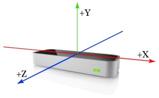 手のひらの位置の値は (X, Y, Z) の順で、以下の座標軸での値(単位は mm)です。上の図の ID 6 の手を例にとると、Leap Motion 本体の中心から、X軸方向に -107.8mm(つまり左)、Y軸方向(上)に 167.3mm、Z軸方向(手前)に 23.1mm の位置に手のひらの中心がある、というデータです。