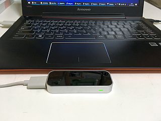 Leap Motion は以下の写真のようにパソコンの手前に置いてください。USB ケーブルが左側から出ている(緑色の電源ランプが見える)向きです。
